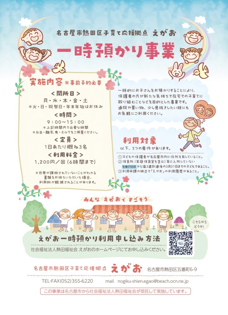 | 申し込み方法 | 社会福祉法人熱田福祉会「名古屋市熱田区子育て応援拠点えがお」のホームページにてお申し込みください。 |